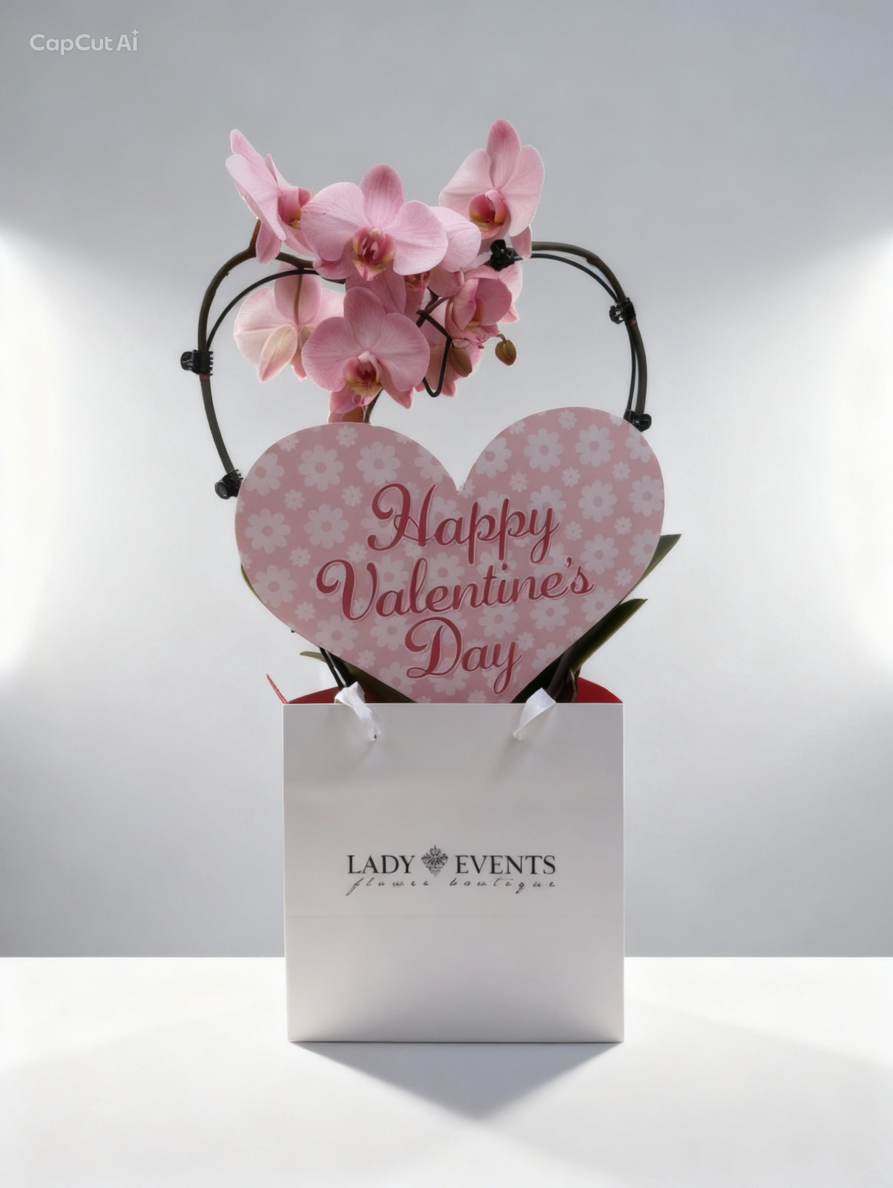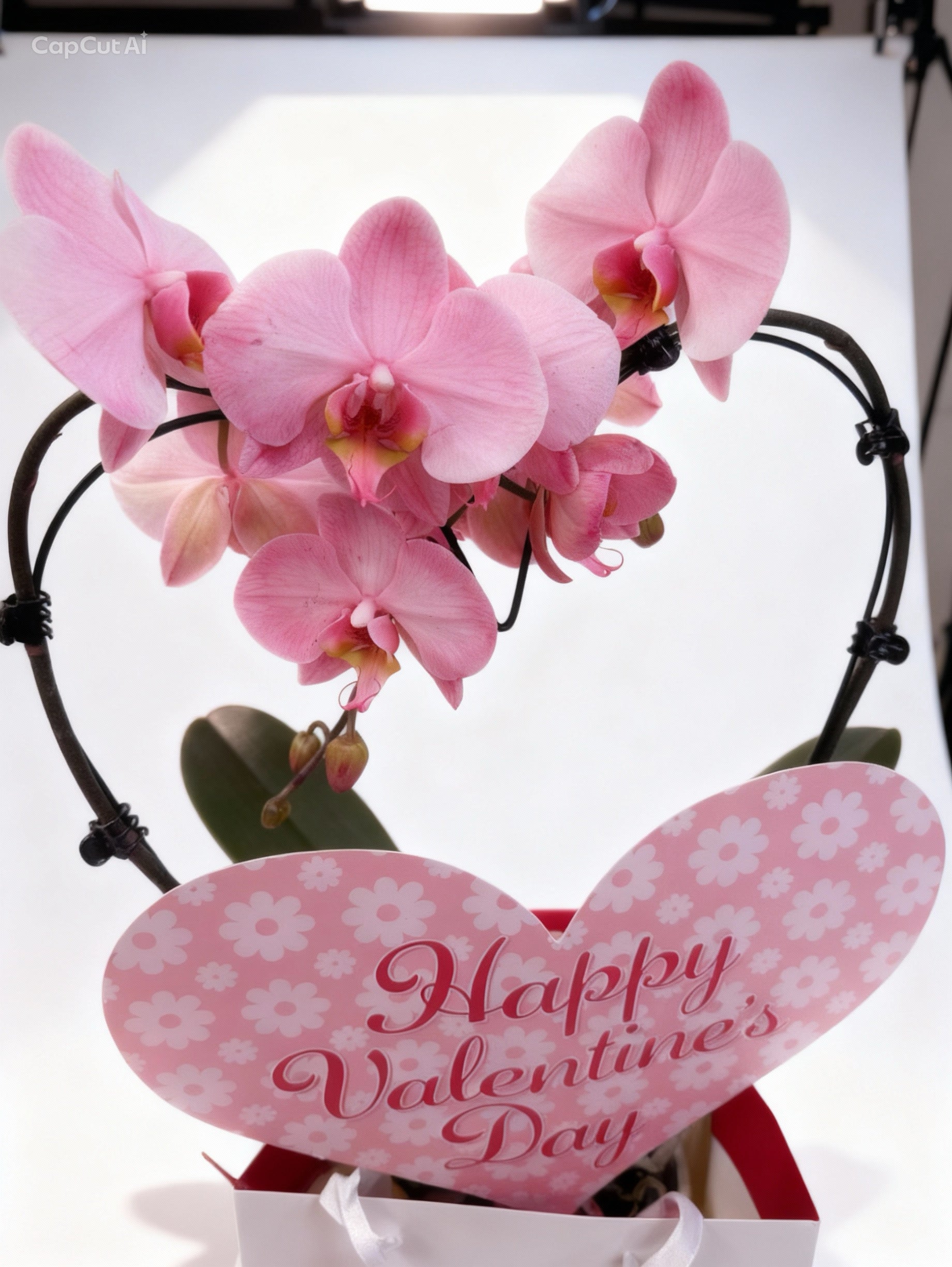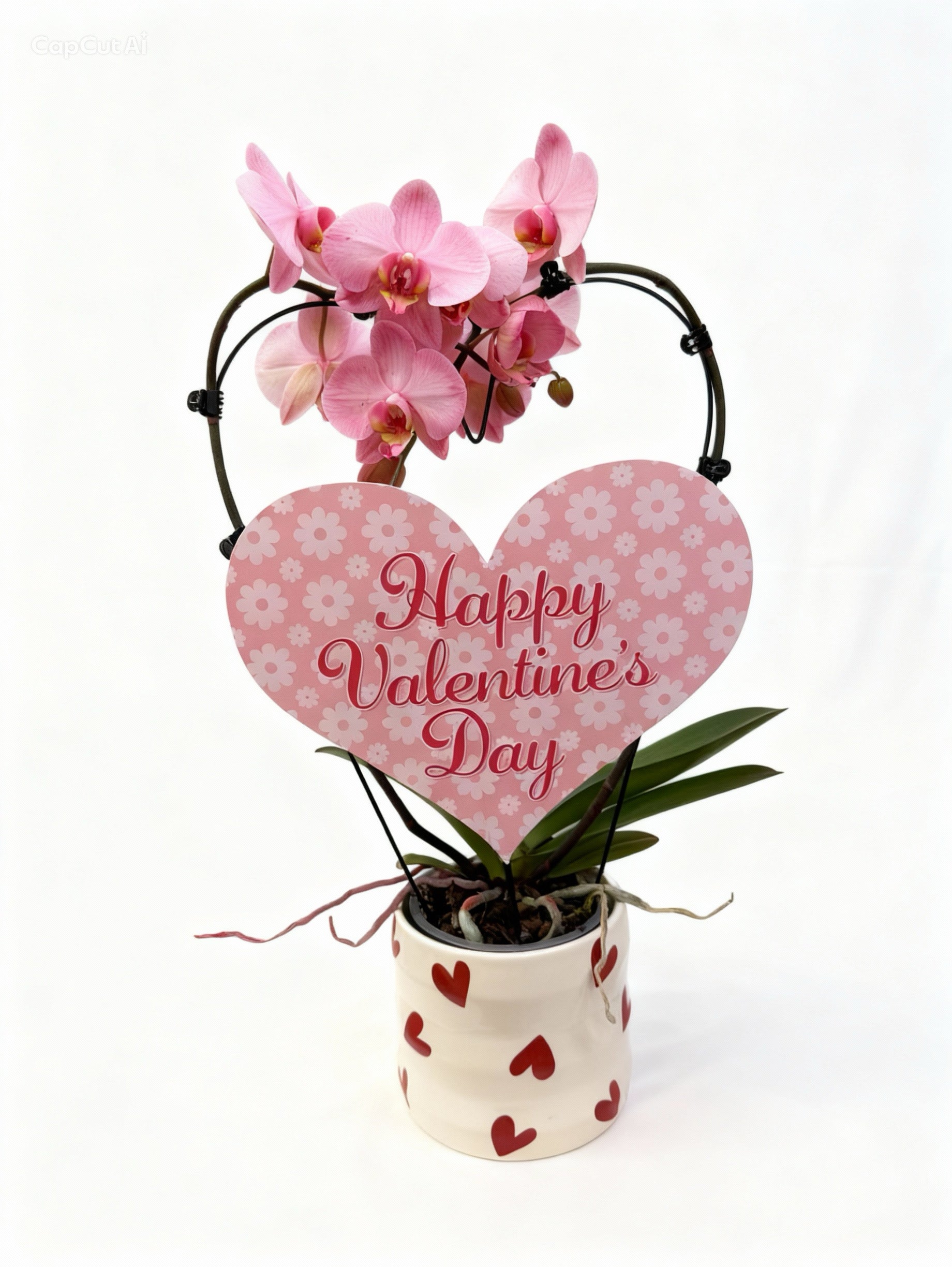 Orhideea Phalaenopsis roz este aranjata pe suport metalic in forma de inima si asezata intr-un vas ceramic decorat cu inimioare rosii, cu înălțimea de 50 .